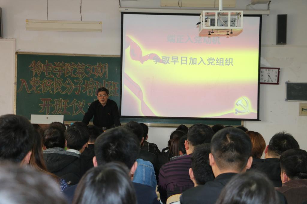 “东西南北中,党是领导一切的。”为进一步坚定入党积极分子的理想信念,严格抓好学生党员的发展工作,蓝莓视频于2018年4月10号在求真楼4010教室举办第三十期入党积极分子培训班开班仪式。本次开班式由我院党总支书记赵庆福主讲,团总支书记刘毅主持,物电学院第三十期全体入党积极分子参加本次开班式。