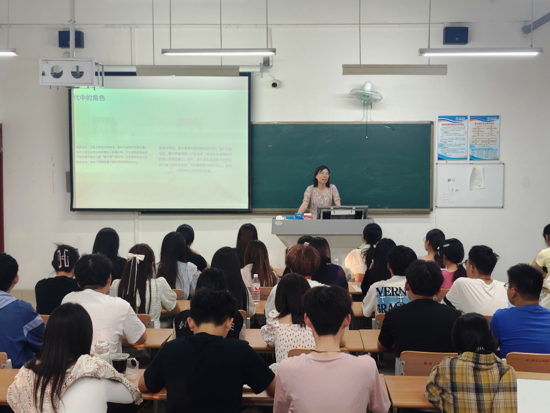 课堂上,董文会以“时代召唤与青年使命”为切入点,结合当前科技创新对国家发展的核心作用,她以“墨子号”团队青年科研人员为例,阐述了青年在科技创新中的主力军地位,强调青年需以党的指引为方向标,勇攀科技高峰。同时结合学院特色,重点展示了物电学子在“挑战杯”“互联网+”等学术竞赛中斩获的优异成绩,并系统展望了学院在量子物理、集成电路等前沿领域的科研规划,彰显学院党建与科研育人深度融合的成果,为学生指明奋斗方向。对于青年学子如何更好的实现个人成长,她提出三点期望:一是夯实专业基础,深入钻研核心理论知识,构建系统扎实且前沿的知识体系,掌握科学高效的学习方法,全方位增强“学习力”,二是投身科研实践,主动地参与到各类研究项目和实践中去,从基础环节入手,勇于动手实验,在实践中锻炼发现问题、设计解决方案的本领,深层次提升“创新力”,三是融入团队协作,深刻理解并认同团队共同的目标与愿景,找准自身定位,勇于承担责任,并主动协作补位,相互支持,多维度凝聚“向心力”。