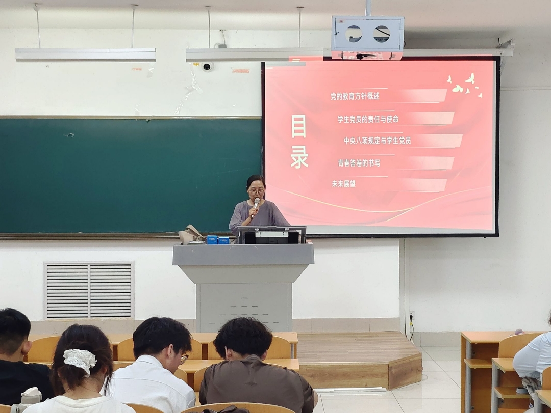 为深入贯彻党的教育方针,强化青年党员思想政治引领,6月23日下午,物电学院副院长贾冉为全体学生党员、入党积极分子讲授“传承·创新·担当——党的教育方针与我们的青春答卷”专题党课。