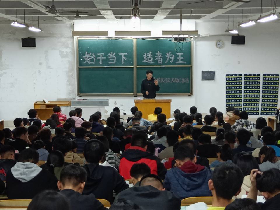 报告会一开始,马云天就问了同学们一个问题“大学生活与高中生活最大的不同是什么?”,依据同学们的回答,马云天由自己刚刚结束的大学生活出发,从进入大学后的学习、生活、工作、友情等不同方面给同学们进行了一一讲解,向同学们诠释了大学阶段对同学们职业生涯发展的意义。同学们听得若有所思。会议进行到问答互动环节,同学们踊跃发言,在一问一答中,一个又一个困扰同学们的问题迎刃而解。马云天用坦诚的态度,朴素直白的话语,向学弟学妹们发出了“纸上得来终觉浅,绝知此事要躬行”的倡议之声,希望学弟学妹们能够明白学习的重要性,尽快适应角色转变,真正规划一条属于自己的大学道路。