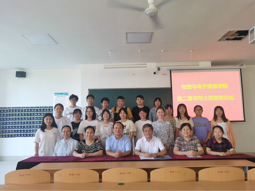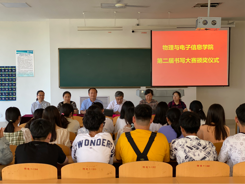 为丰富学生们的校园文化生活,鼓励学生们写好字、练好字,物电学院面向物理学专业(师范类)举办了第二届书写大赛,并于6月11日在明理楼0126召开书写比赛颁奖仪式。此次颁奖仪式由物电学院党总支书记赵庆福、院长刘汉平、副院长邹艳、各系主任、班主任老师等主持召开,获奖同学参加本次仪式。