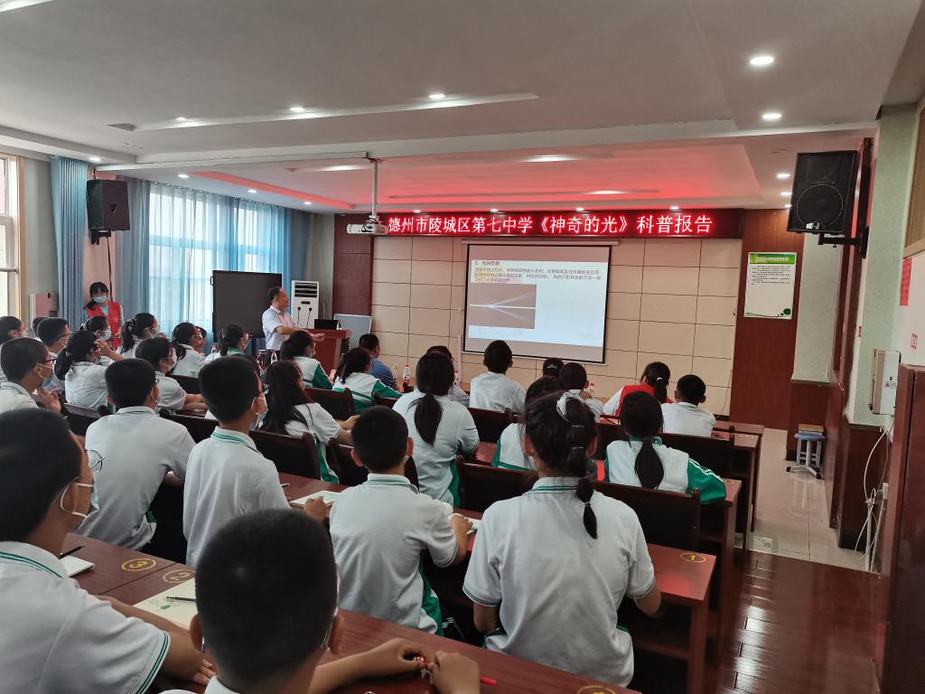 物电学院的师生首先来到陵城区实验小学与老师们深入交流,了解支教生的情况。随后,物电学院的师生来到陵城区第七中学。物电学院院长、德州市人工智能研究会会长刘汉平为七中的同学做了一场《神奇的光》的科普报告。报告从什么是光、光的现象及光的应用三个方面,向学生介绍了身边的光学现象和光学规律。报告深入浅出,图文并茂,同学们积极回应,现场气氛火热。然后物电学院的学生志愿者们现场进行了乐高机器人、六足机器人装置以及物理小实验的演示,引起了同学们的浓厚兴趣,激发了探究科学的强烈愿望。物电学院的老师还与陵城第七中学的老师、德州学院的支教生们,针对物理学人才培养方案等话题进行了座谈。支教的同学们畅谈了自己支教的收获、感悟,中学领导对支教同学的表现也给予了充分肯定和高度评价。