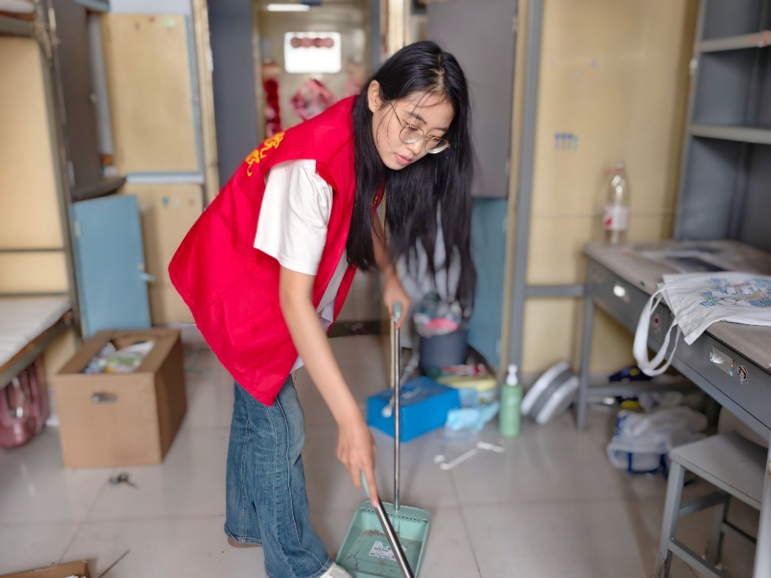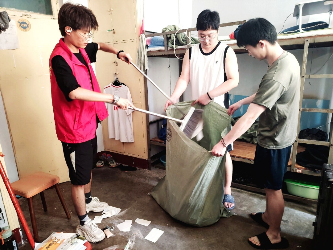 活动期间,毕业生们以宿舍为阵地,掀起一场“断舍离”与“焕新颜”的行动热潮。各宿舍成员分工协作,将书籍、衣物、生活用品等分类整理,将仍具使用价值的物品则通过学院与公益组织合作的渠道,捐赠给有需要的群体。在物品流转的同时,宿舍清扫工作也如火如荼展开,毕业生们手持清洁工具,对门窗玻璃、床铺柜架、卫生间等区域进行深度清洁。原本略显杂乱的宿舍,经过毕业生们的精心打理,变得窗明几净、井然有序,同学们相互协作、默契配合,展现出高度的集体凝聚力与奉献精神。校园里,那一个个忙碌的身影,不仅美化了校园环境,更彰显了新时代大学生的青春风采与文明素养,成为毕业季里一道独特而温馨的风景线。