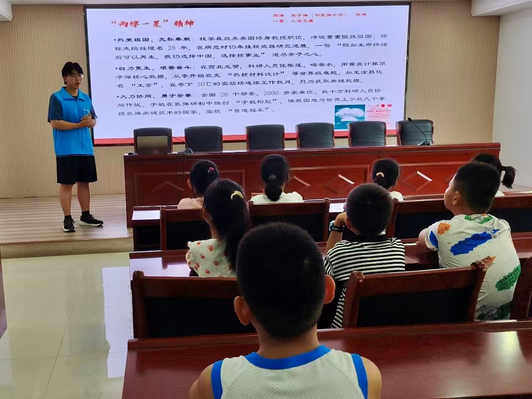 宣讲团继而走进平原县龙门街道金河源社区暑托班,为当地儿童开展 “两弹一星” 精神主题宣讲。活动通过动画短片、科学实验、故事讲述等多元形式,向孩子们生动诠释 “两弹一星” 精神的丰富内涵。从聆听红色故事到缅怀革命先烈,再到向青少年传递精神力量,宣讲团成员在实践中完成了一场意义深远的 “精神接力”。未来,团队将继续深入挖掘红色资源,让 “两弹一星” 精神在青少年心中生根发芽、代代相传。