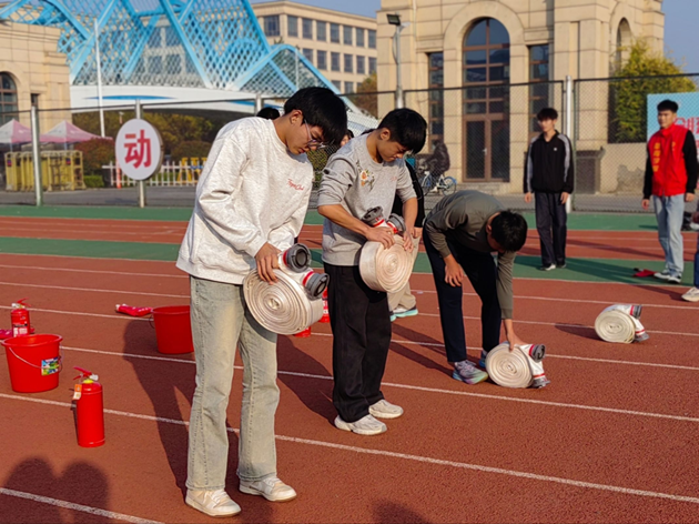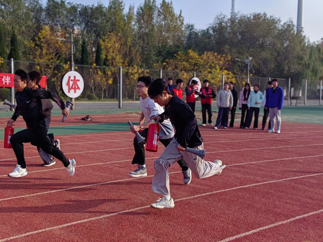运动会共设置4×50消防灭火接力赛、4×20消防营救接力赛、百米消防物资运输挑战赛及消防知识竞答赛四大项目,涵盖灭火操作、伤员营救、物资运输、知识问答等多个维度,吸引全校师生积极参与。运动赛场上,参赛队员默契配合、奋勇争先,在老师带领下熟练完成灭火器使用、防烟面罩佩戴、水带连接、伤员转运等任务,展现了极强的实操能力;知识竞答环节中,选手们反应迅速、应答精准,充分体现其扎实的消防知识储备。活动现场掌声热烈,师生们纷纷表示通过沉浸式学习和互动体验,真切感受到了消防安全的重要性。