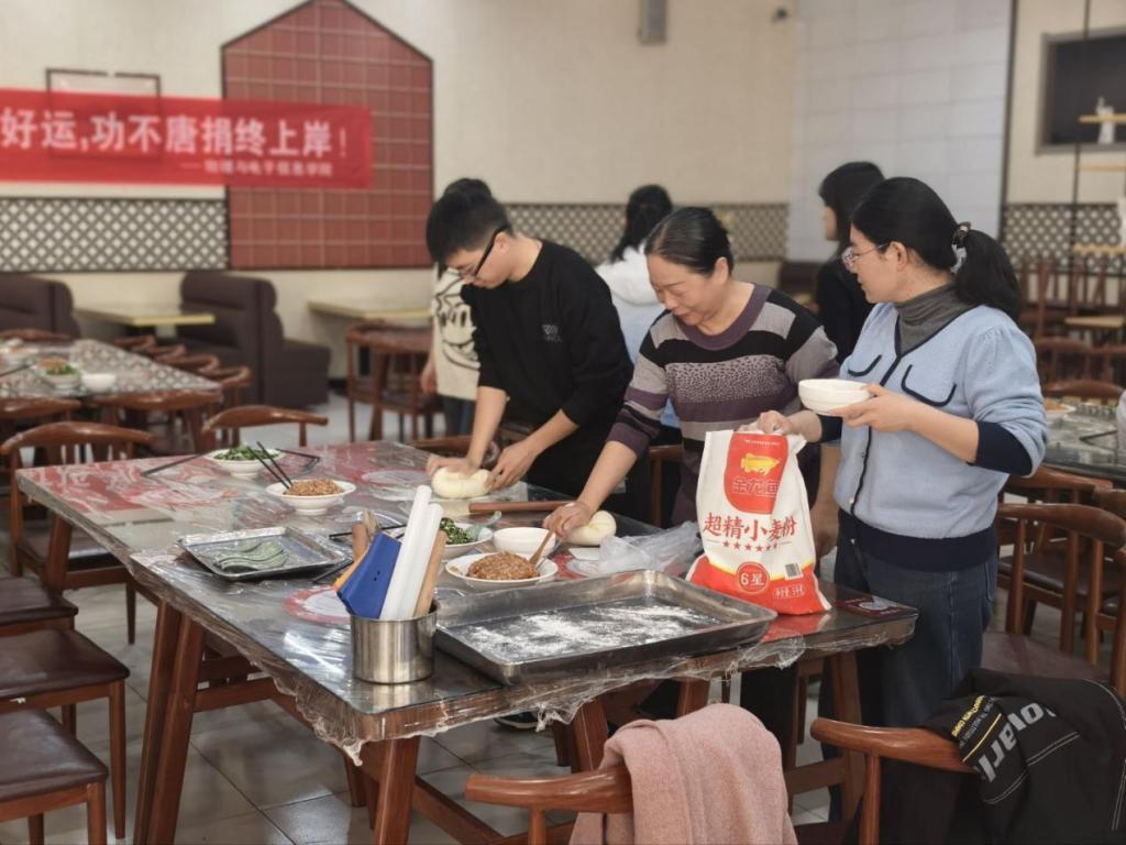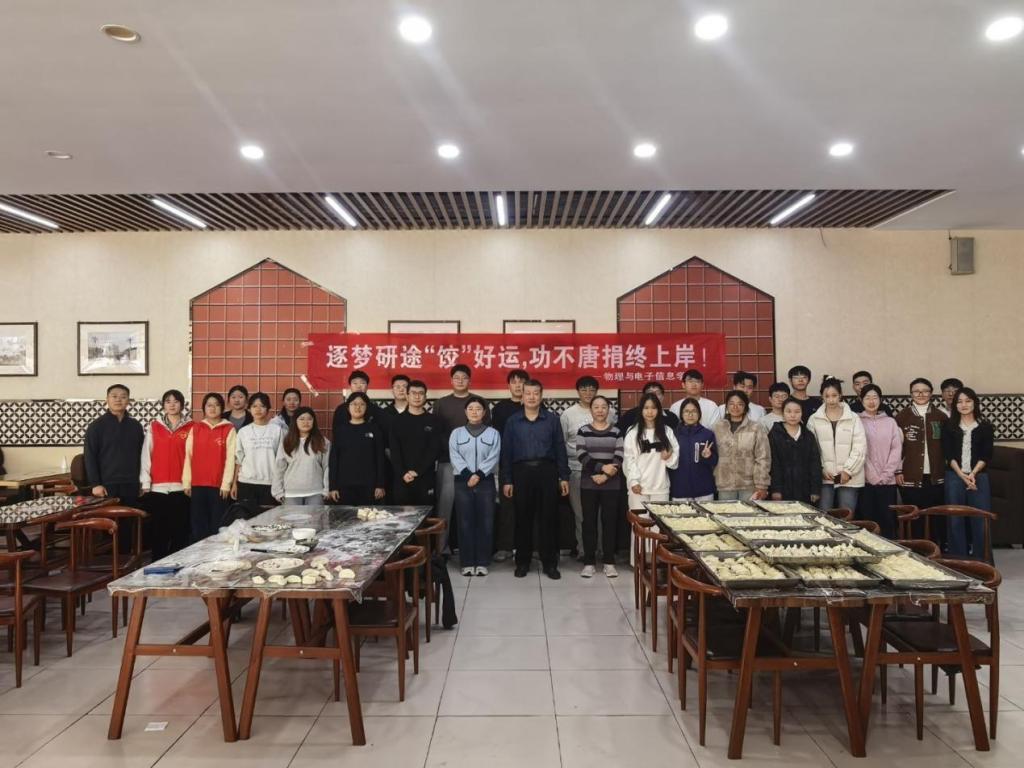 为缓解考研备考压力、传递学院关怀,增强考研学子的归属感与自信心,物电学院于11月15日在教职工餐厅举办“逐梦研途‘饺’好运,功不唐捐终上岸”考研送温暖活动。学院党委书记申青林、副书记刘秀华、辅导员、教师代表及部分考研学子参与此次活动。