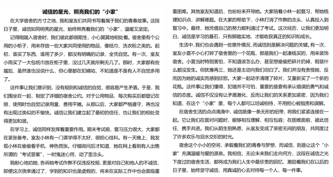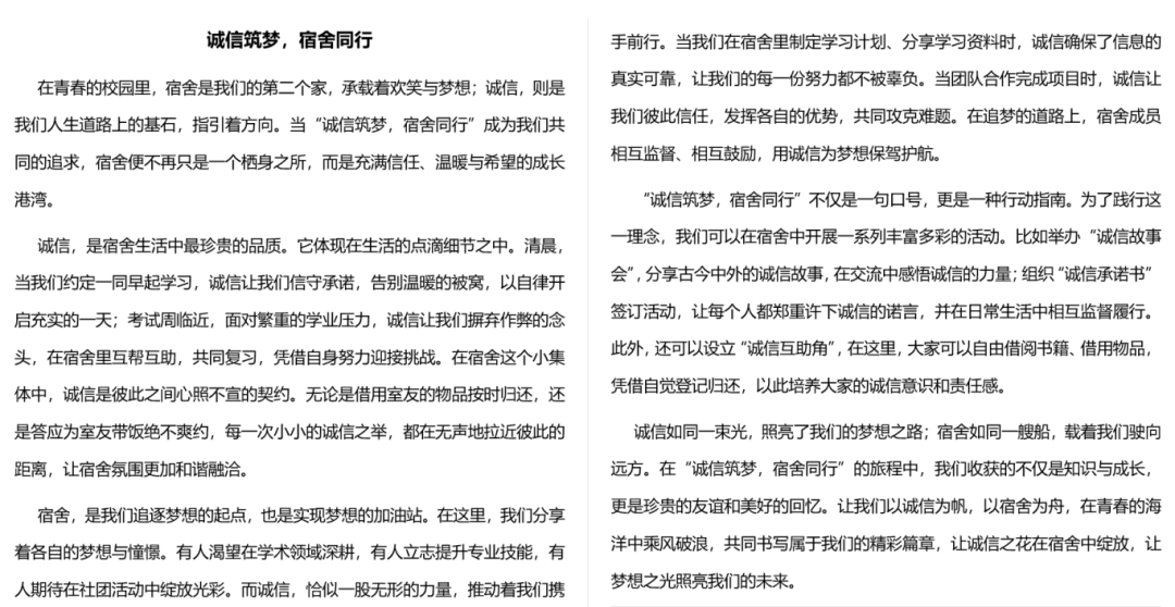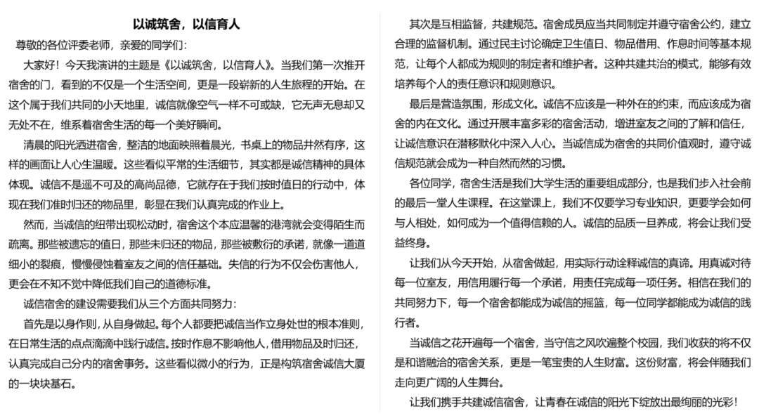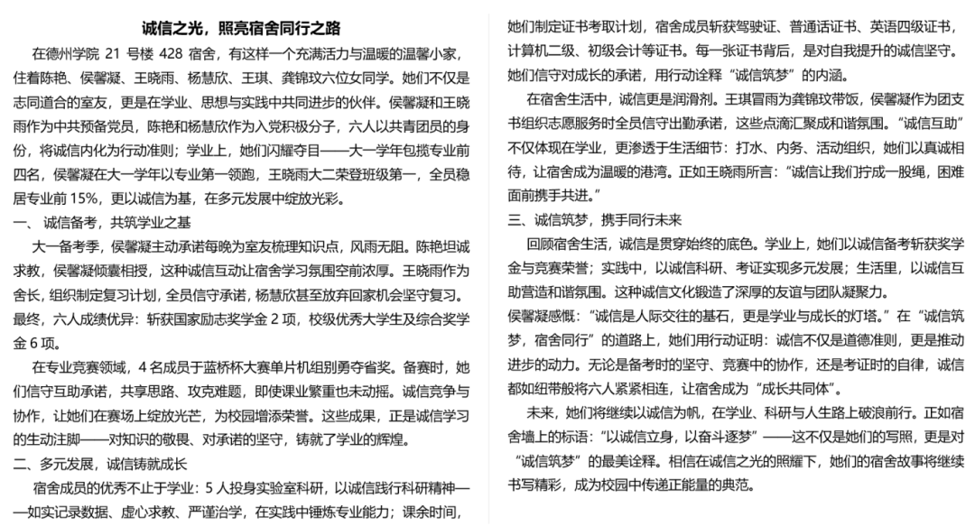 诚信践行的千万种模样,每一种都是从心出发的责任坚守。希望大家都能真诚地守护诚信与热爱宿舍生活,构筑最温暖的集体!此次活动的开展,为同学们搭建了一个展现诚信内涵、激发创新活力、营造和谐氛围的舞台,相信在此次活动的倡导下,德州学院的学子们将更珍视诚信价值,以更饱满的热情共建文明校园。