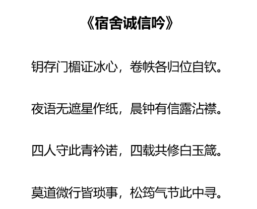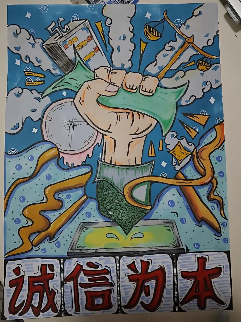这些作品既展现了同学们对宿舍诚信主题的深入思考,又凸显了他们的创作才华。这些作品将成为校园的独特亮点,引导更多人践行诚信美德,释放创造力,共同打造充满正能量的校园生活空间。
