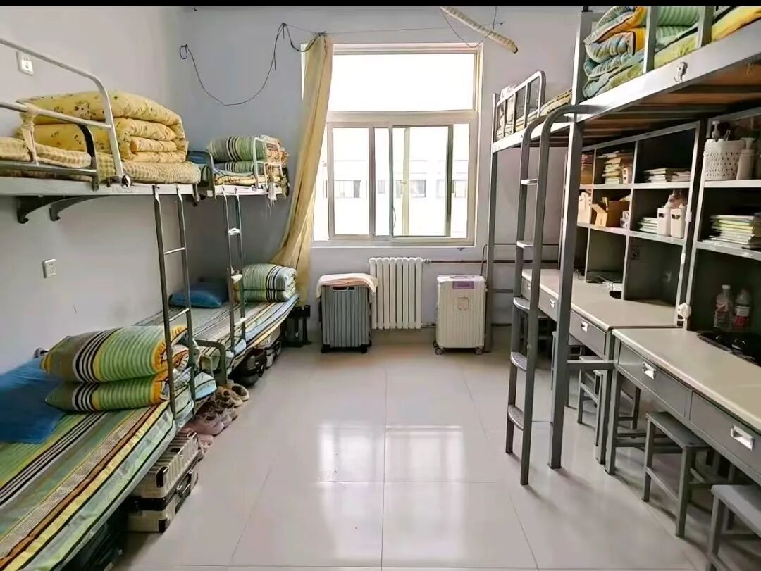 501宿舍尽显清爽整洁的生活风貌:地面一尘不染,书桌物品按类归置、错落有序,体现同学们有条不紊的生活节奏;床铺被褥棱角分明、平整统一,铺就出舒适利落的休憩角落;窗户洁净透亮,窗帘轻垂规整,阳光漫入时,整个宿舍都浸着温馨明亮的氛围。