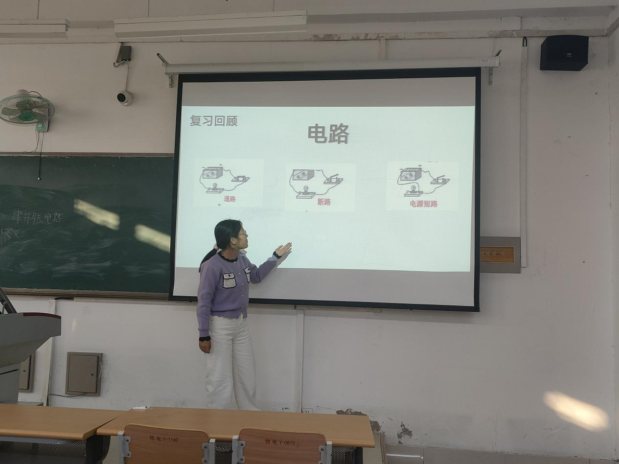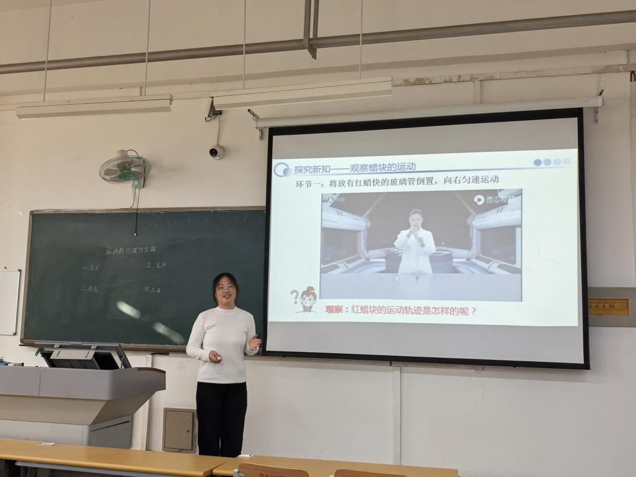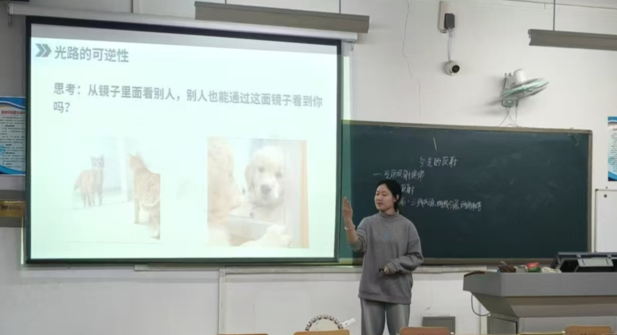 活动前期,参赛同学围绕“电路基础”“运动的合成与分解”等中学物理知识点,完成了教案设计、课件制作与模拟演练;比赛现场,选手们依次进行十分钟课堂试讲:有的借助串并联电路示意图拆解概念,逻辑清晰、互动性强;有的则像图中同学一样,以“光路的可逆性”为知识点,结合趣味思考与生动配图,打造出轻松且有互动感的课堂氛围;还有选手以“红蜡块运动”实验为切入点,结合动画演示讲解运动的合成,课堂设计生动直观。评委老师从教学目标达成度、课堂节奏把控等维度点评指导,现场同学也积极交流试讲技巧,氛围热烈。