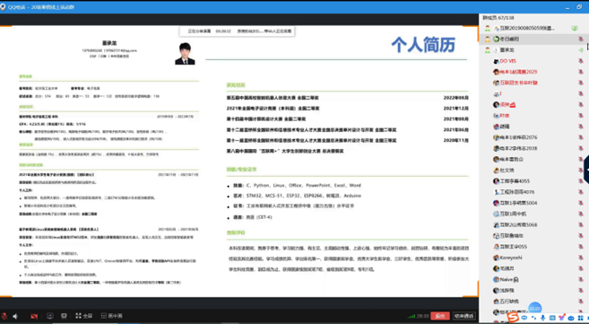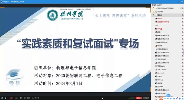 近日,蓝莓视频举办的“实践素质和复试面试”专场活动圆满结束。本次活动面向2020级物联网工程专业、电子信息工程专业学生,2024年2月1日下午采用线上方式进行,近70名学生参与。
