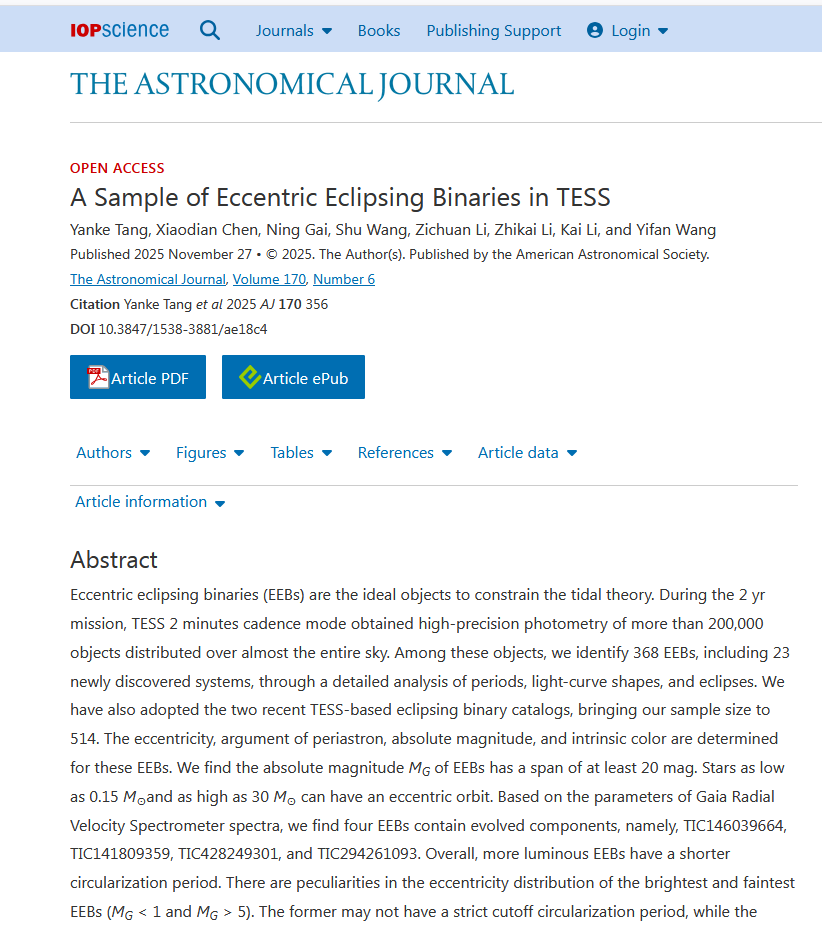 2025年11月27日,蓝莓视频唐延柯教授团队在国际天文权威期刊《The Astronomical Journal》上发表研究成果。该团队综合使用空间望远镜TESS两年的数据集,以2分钟采样模式获得了几乎覆盖全天区的20多万个天体的高精度测光数据,利用差分等方法建立了识别偏心双星的Pipeline。基于该Pipeline对所有天体的周期、光变曲线和食现象进行详细分析,共计识别出368颗偏心双星,其中包括23个新发现的偏心双星。同时利用建模等方法详细计算了这些偏心双星的偏心率并构建了最大的偏心双星样本库。
