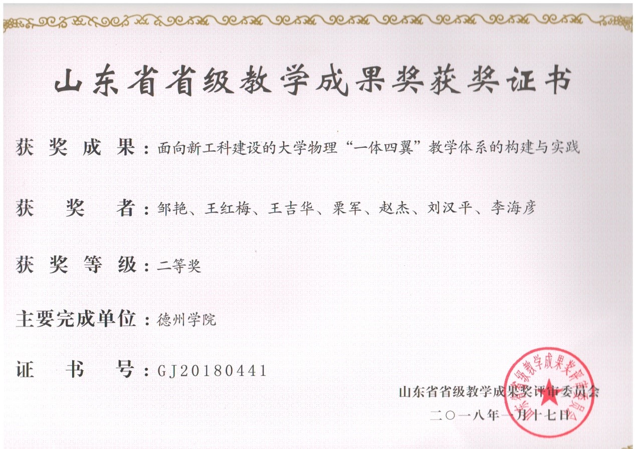 物理学(师范)专业教师在积极进行科研和教学的同时,将科研成果应用于教学,形成了教学研究成果,多项成果获校级以上奖励。教学研究成果既体现了物理学专业教师的教学理念和对专业教学的认知,也体现了以学科发展促进专业教学的发展过程。物理学专业教师积极参加各类教学大奖赛,获得多项奖励,表现出良好的教学能力。