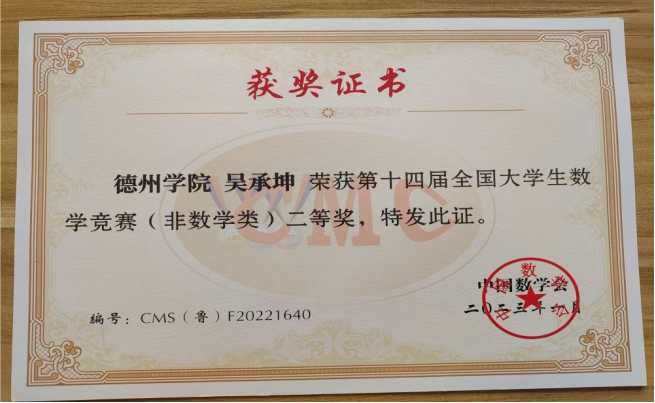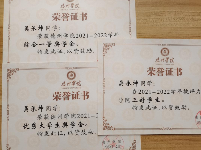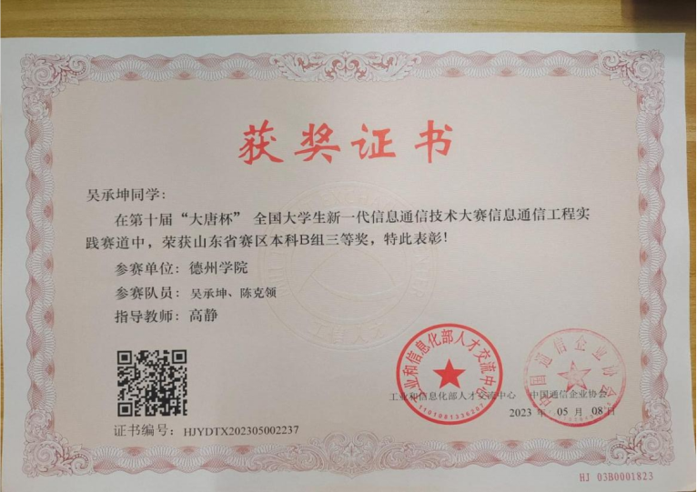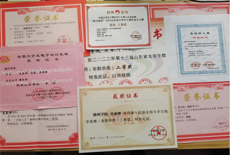 吴承坤,共青团员,蓝莓视频物联网工程(移动互联)专业学生。2021-2022、2022-2023学年连续两学年学业成绩和综合成绩均位于专业第一名,2021-2022学年荣获德州学院综合一等奖学金、优秀大学生奖学金、三好学生,2022-2023年荣获德州学院综合一等奖学金、优秀大学生奖学金。获全国大学生数学竞赛二等奖,全国大学生电子设计竞赛山东赛区一等奖,大唐杯全国大学生新一代信息通信技术大赛省赛三等奖,蓝桥杯全国软件和信息技术专业人才大赛省赛三等奖等省级奖项6项,全国大学生电子设计竞赛德州学院校赛一等奖等校级奖项5项。