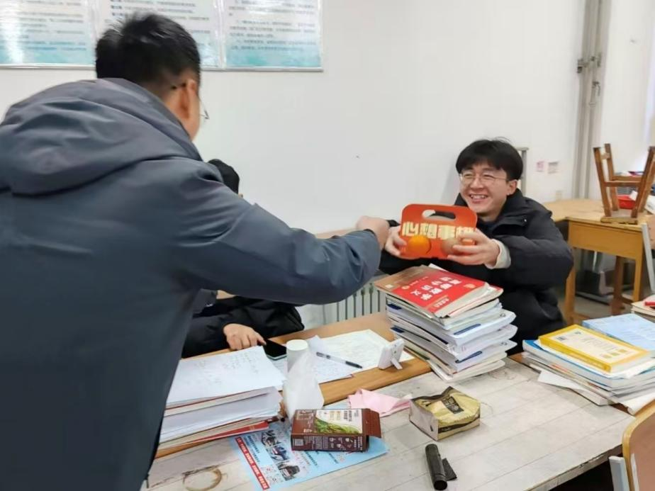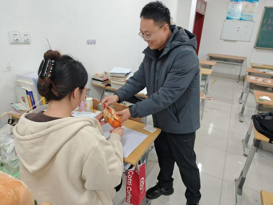 11月20日,学院又将温暖延续至考研教室,开展“‘苹’稳上岸,一战‘橙’硕”主题活动。活动中,学院老师们为考研学子送上精心准备的水果礼盒——寓意心想事“橙”的甜橙、象征“苹”安顺利的苹果,还有承载着美好期许的定制明信片。