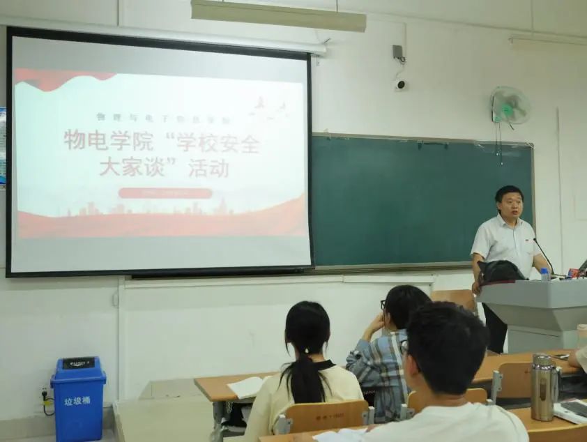 为进一步增强学生的安全防范意识,提高学生的自我保护能力,营造安全、和谐、稳定的校园环境,6月24日,物电学院于明理楼216教室举行“学校安全大家谈”活动。本次活动由唐延柯院长担任主讲人。