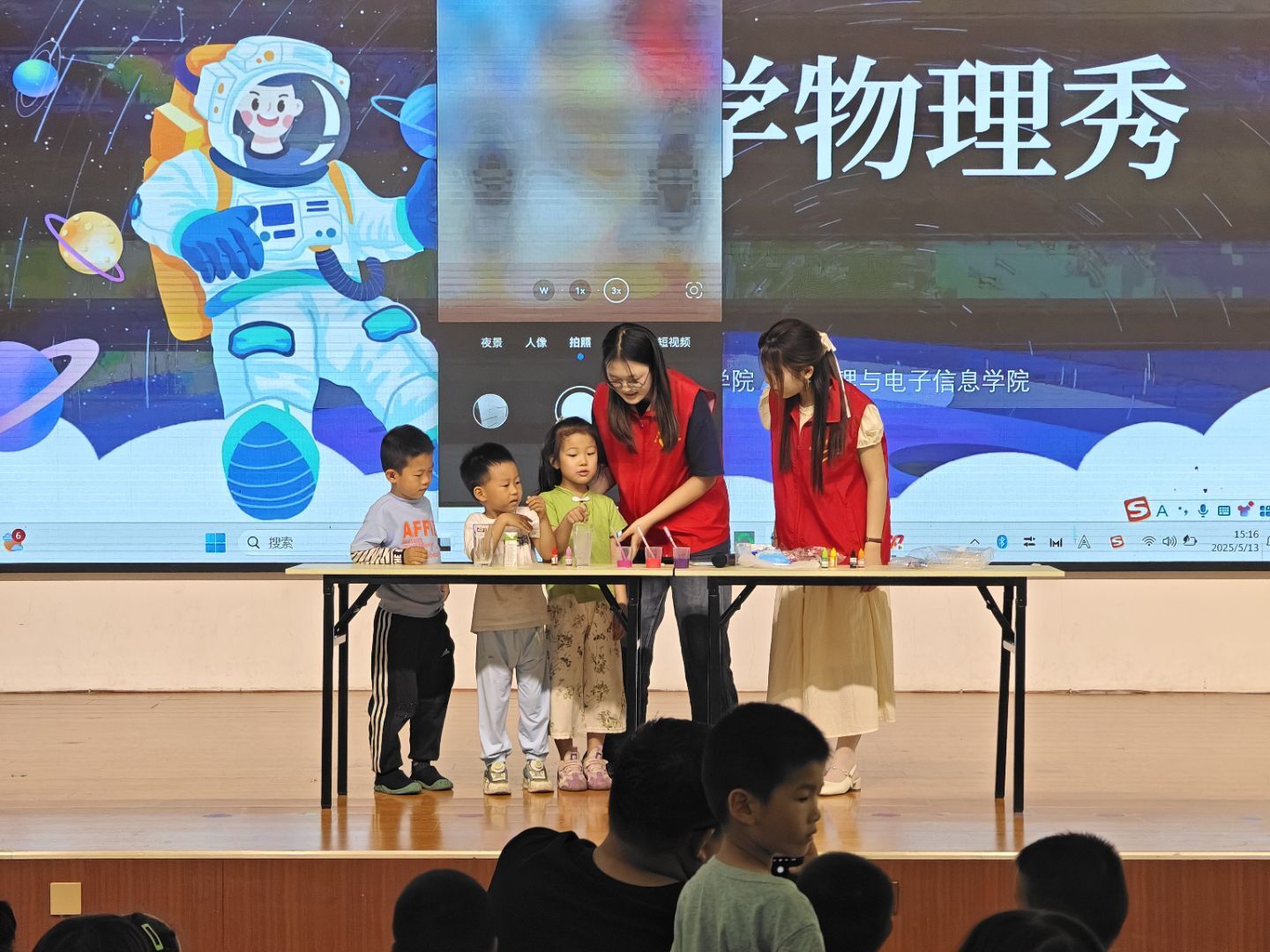 为激发少年儿童对科学的探索热情,培养创新思维与实践能力,5月13日,物电学院“星光”科普志愿服务队在妇女儿童中心开展“科学物理秀”星光科普活动,通过趣味实验带孩子们解锁物理世界的奇妙密码。