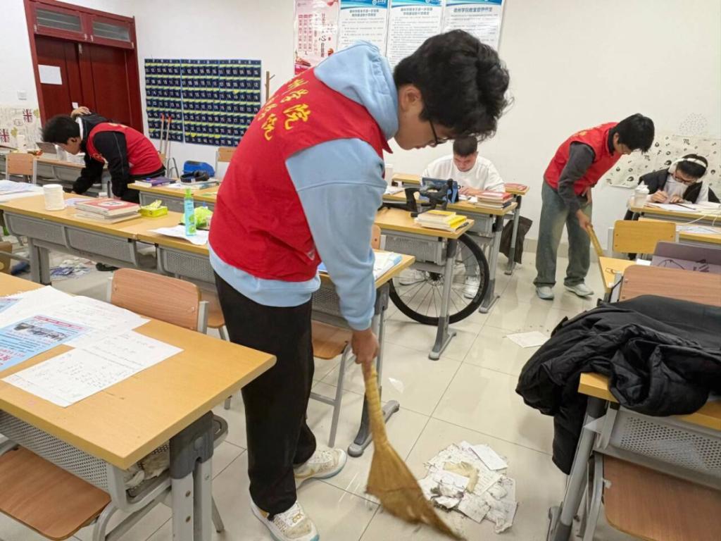 活动前,学院提前划分责任区域、明确分工,志愿者们携带清扫工具准时集结,以饱满的热情投入到服务中。清扫过程中,志愿者们分工协作、默契配合:有的仔细擦拭桌椅表面的灰尘与笔迹,有的认真清理地面的纸屑与杂物,有的规整散落的书籍资料,有的对门窗、墙角等卫生死角进行重点清扫。大家不怕脏、不怕累,不放过任何一处细节,经过数小时的辛勤劳作,考研教室的桌椅摆放整齐有序,地面干净整洁,整体环境焕然一新,为备战考研的学长学姐们打造了窗明几净的学习空间。期间,不少路过的考研学子对同学们的暖心举动表示感谢,现场洋溢着互助友爱的温馨氛围。