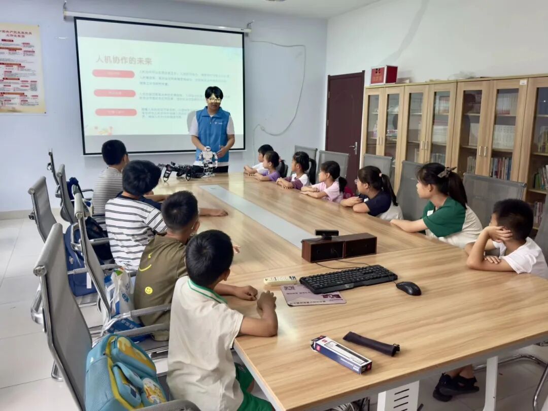 上午的贝州社区,孩子们的笑声像夏日的蝉鸣般清脆。我们先在社区活动室开展机器人讲解,当机器人映入眼帘,孩子们眼中瞬间亮起的光芒。志愿者拿起遥控器操控机器人和小朋友们打招呼、前进、转圈、做仰卧起坐,一边演示一边讲解基础原理:“大家看,机器人能活动,是因为里面的电机在转动,就像我们的手臂靠肌肉带动一样。”有个小姑娘怯生生地问:“哥哥,机器人能像宇航员叔叔一样上太空吗?”这个问题让志愿者愣了一下,随即笑着回应:“只要你们好好学习科学知识,将来不仅能让机器人上太空,还能亲自设计更厉害的设备呢!”说完,志愿者邀请她上台近距离观察机器人的构造,她小心翼翼触碰机器人的指尖,让我想起“两弹一星”元勋们当年探索未知时的那份敬畏与执着。