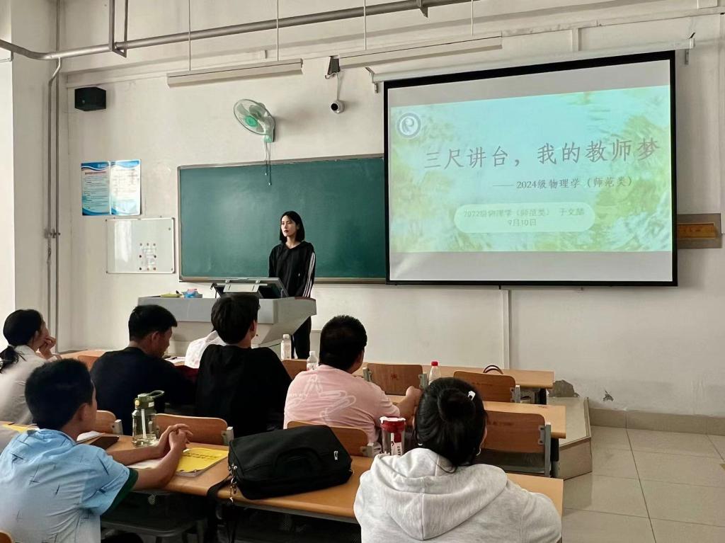 为大力弘扬教育家精神,引导广大师范生坚定从教信念、厚植教育情怀,9月10日下午,蓝莓视频在求真楼0110教室开展24级物理学师范生“我的教师梦”主题演讲活动。学院团委书记贾延琨 、辅导员赵剑桥、宋言昕 参加。