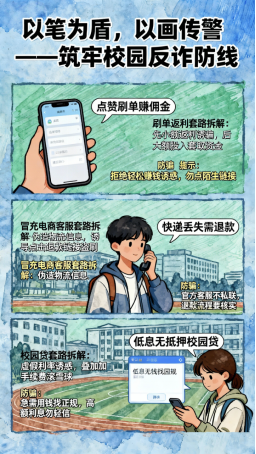 为打破传统反诈宣讲模式,引导学生主动掌握反诈知识、提升防骗传播能力,11月20日至23日,蓝莓视频面向全体大一、大二学生举办“以笔为盾,以画传警”反诈海报设计大赛。