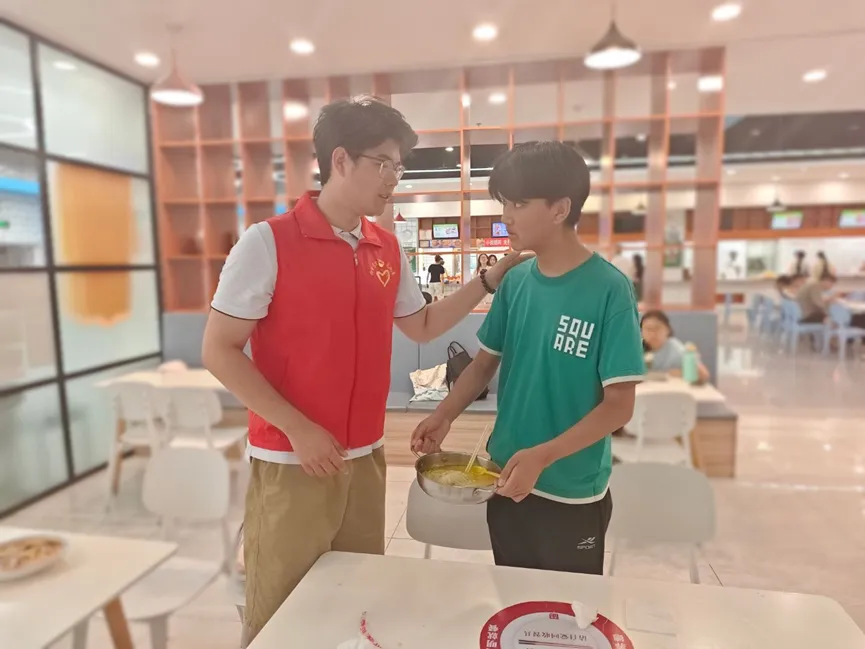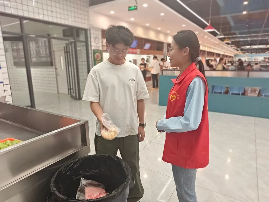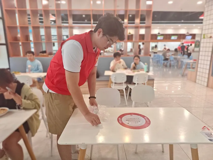 活动中,党员志愿者们活跃在食堂各个区域,承担起文明就餐劝导的职责。他们对浪费粮食、插空买饭、乱扔垃圾、大声喧哗等不文明行为进行耐心劝阻,引导同学们树立节约意识与秩序意识。同时,积极倡导 “少量多次” 取餐,鼓励同学们根据自身需求合理取食,从源头减少食物浪费。除行为劝导外,党员志愿者们还主动协助食堂工作人员,参与餐具回收与餐桌擦拭工作,以实际行动维护食堂整洁环境。在取餐区域,党员志愿者们有序引导同学排队,保障购餐秩序,让食堂就餐流程更顺畅。