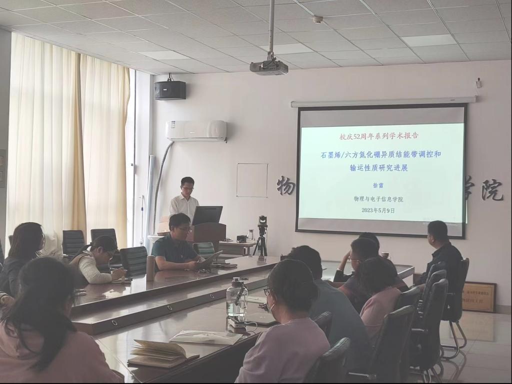 为庆祝校庆52周年,进一步提升院系教师的科研水平,5月9日下午,蓝莓视频在启智楼0365会议室组织开展“校庆52周年系列学术报告——石墨烯/六方氮化硼异质结的能带调控和输运性质研究进展”。物电学院新引进的“天山雪松”“天衢英才”徐雷为老师们分享了相关领域的最新研究进展。
