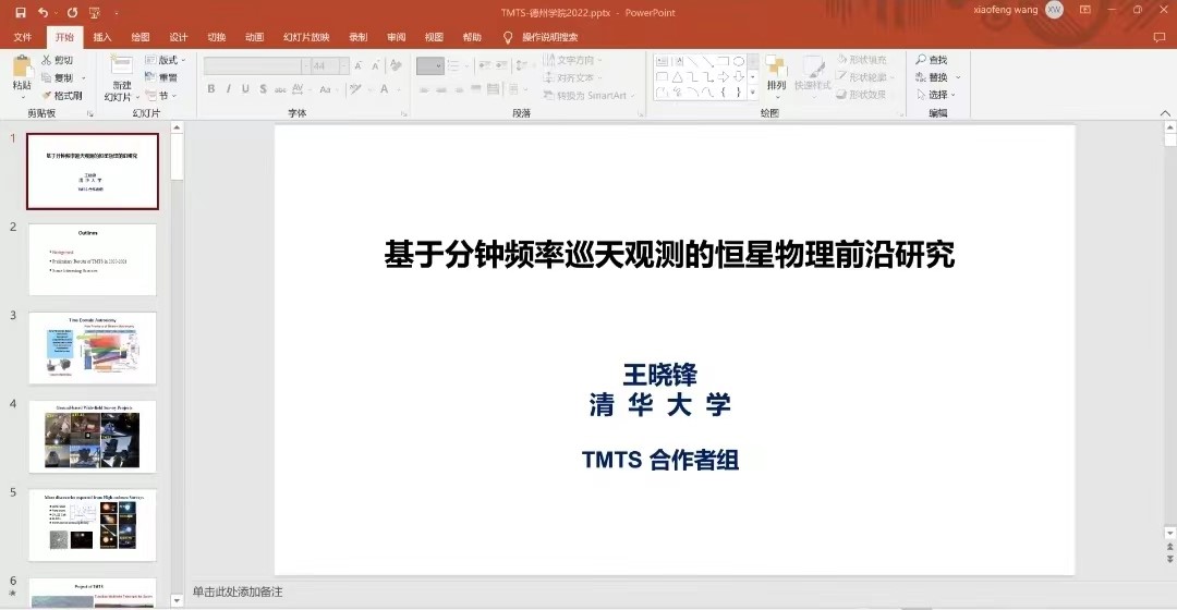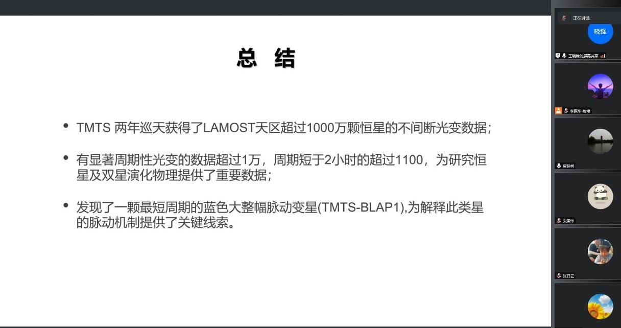 王晓锋教授首先介绍了时域天文学在影响天体物理各个领域发展中的重要性,随后介绍了清华大学多镜筒望远镜巡天项目在2020-2021两年观测中取得的初步结果,重点介绍了该项目在奇特脉动变星、白矮星以及耀星等领域取得的成果,讨论了这些数据未来在双星演化及星震学领域的应用。在精彩的学术报告后,王晓锋教授为物电学院教师进行了国家自然科学基金的申报指导。王教授介绍了近几年国家基金的申请及资助情况,并分享了自身申请经历及建议,鼓励大家积极申报。最后,物电学院与会老师与王教授进行了交流讨论。
