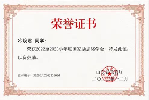 信念是人生道路上的一盏明灯。冷焕君始终坚信:没有人能随随便便的成功,成绩的取得是无数日夜付出的成果。因此她始终将学习放在第一位,目标清晰,态度端正。身为班干部,她对自己要求也十分严苛,在学术之路上刻苦钻研,毫不懈怠。入学以来,她脚踏实地,一心扑在专业知识的汲取上。在老师的悉心教导与同学们的热心帮助下,她收获了斐然成绩:在 2023 - 2024 学年,专业排名第1名,综合排名第1名,平均学分绩点4.23,凭借学习上的出色表现,荣获省政府奖学金、国家励志奖学金、德州学院优秀大学生奖学金等多项荣誉。
