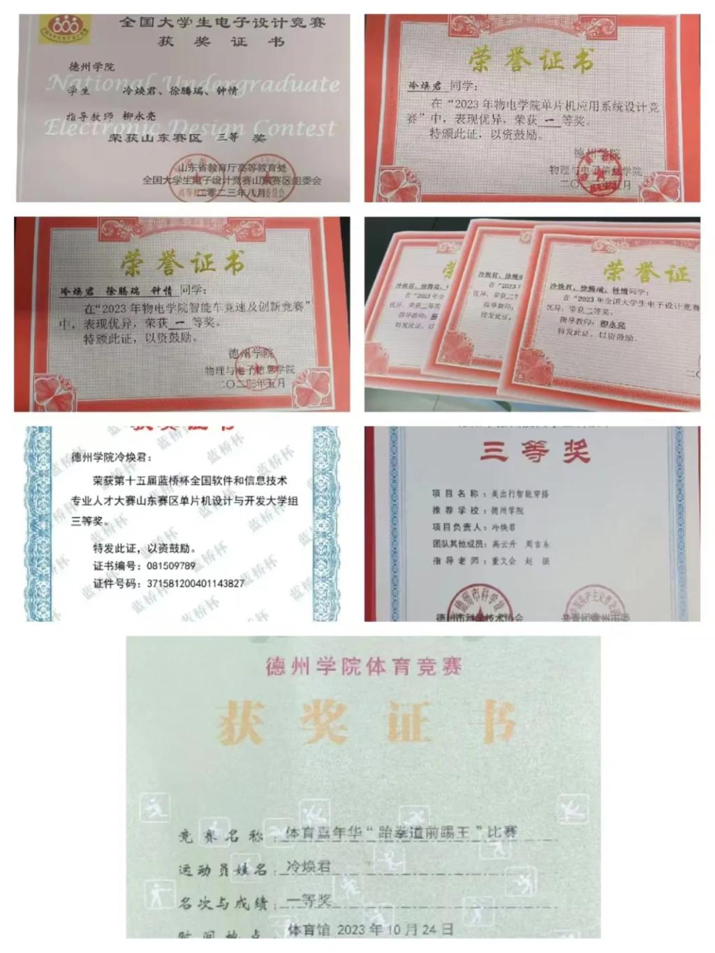 冷焕君在专业知识与实践领域力争做到全面发展,使专业知识和知识技能得到一定的应用和提升。2023 年,她积极投身各类竞赛,于TI杯全国大学生电子设计竞赛(山东赛区)中,凭借其电子设计才能,荣获省级三等奖;在第十五届蓝桥杯全国软件和信息技术专业人才大赛(山东赛区)里,凭借扎实的专业知识,再度斩获省级三等奖。同时,她热爱体育运动,平时加强体育锻炼,在德州学院体育嘉年华“跆拳道前踢王”比赛中,她以出色的表现勇夺校级一等奖。