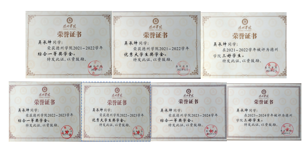 在思想上,他积极向党组织靠拢,以党员的标准要求严格要求自己,不断学习,不断进步,现已成为一名中共党员。他自入学以来明确自己的学习目标,端正学习态度,积极要求进步,认真学习专业知识,课余时间认真钻研专业技能,提高专业能力。经过不懈努力,他连续两学年学业成绩和专业成绩均位于第一名。获得2023年国家奖学金、2023年山东省优秀学生,2021-2022、2022-2023连续两学年荣获德州学院综合一等奖学金、优秀大学生奖学金。